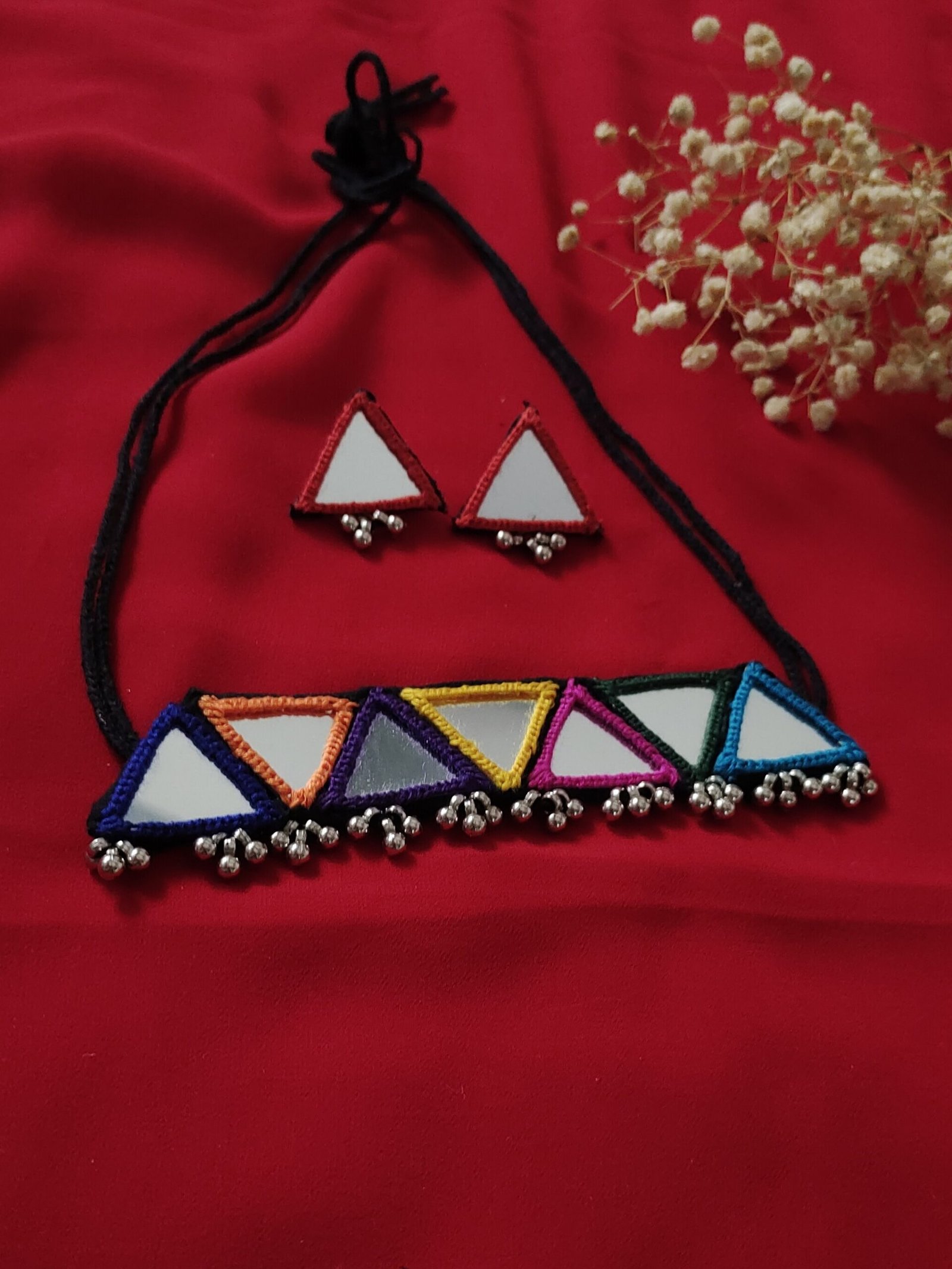 Tags: bohemian look, choker, handcrafted, handmade, mirror work, Necklace, thread work
