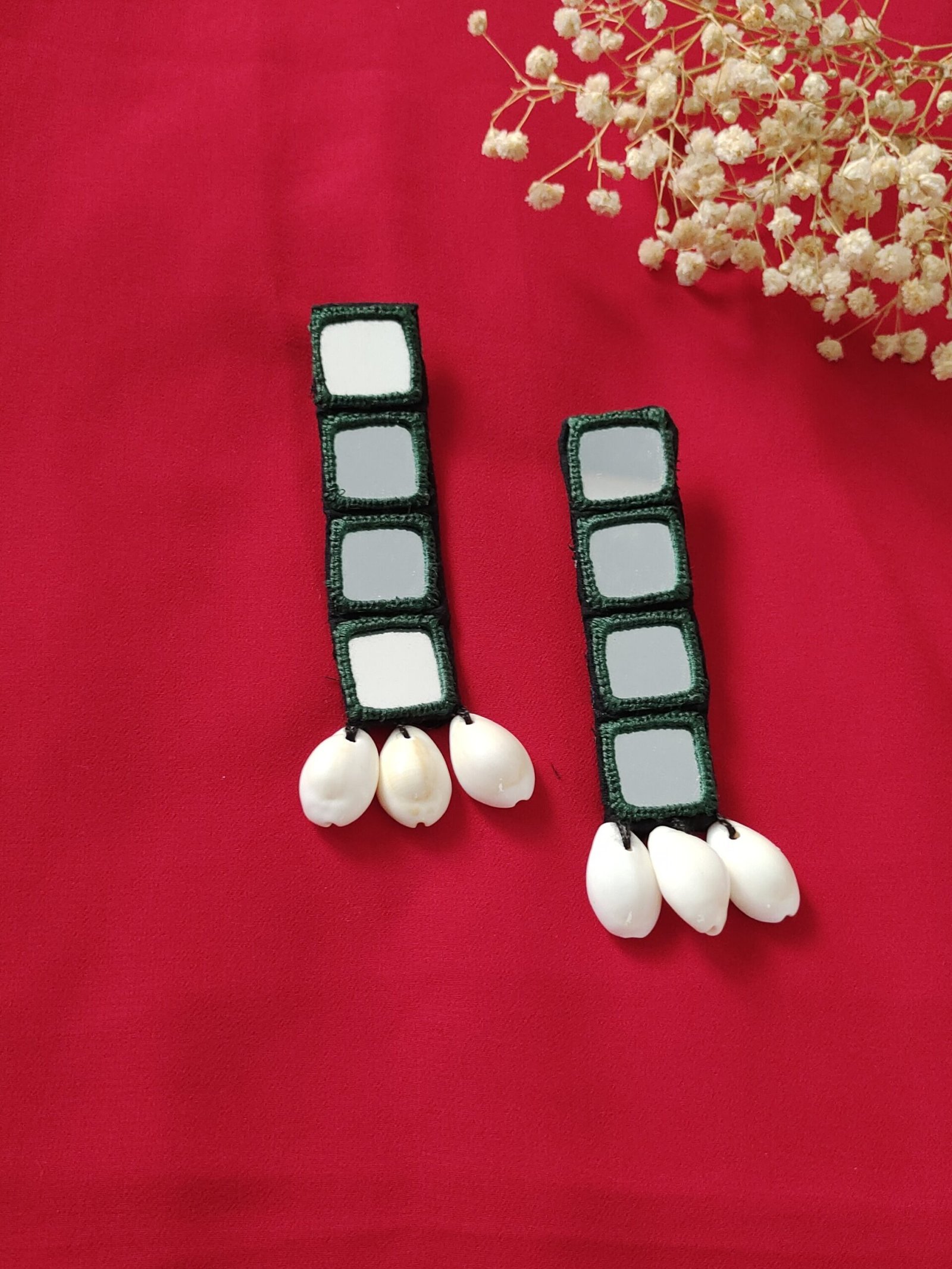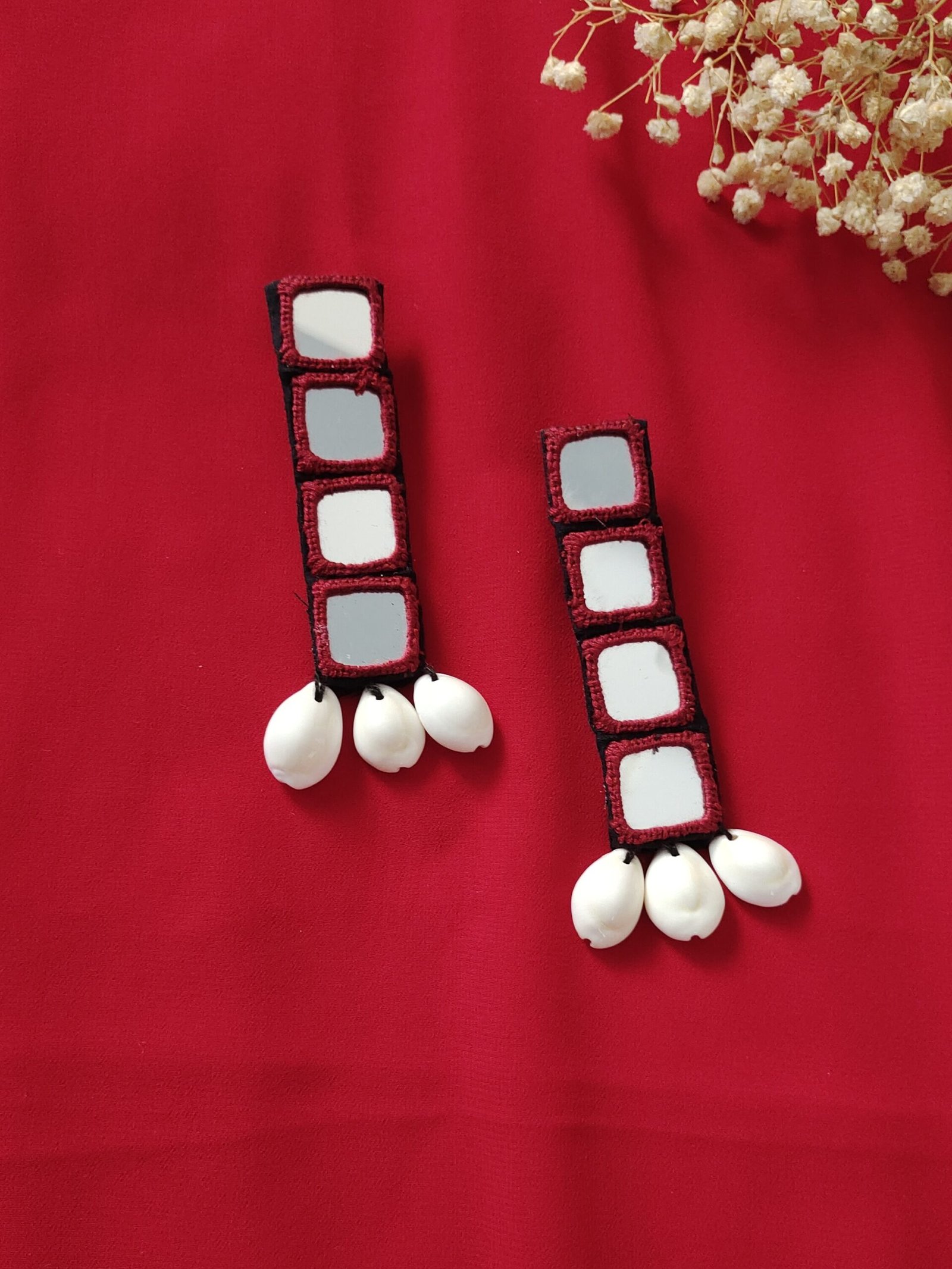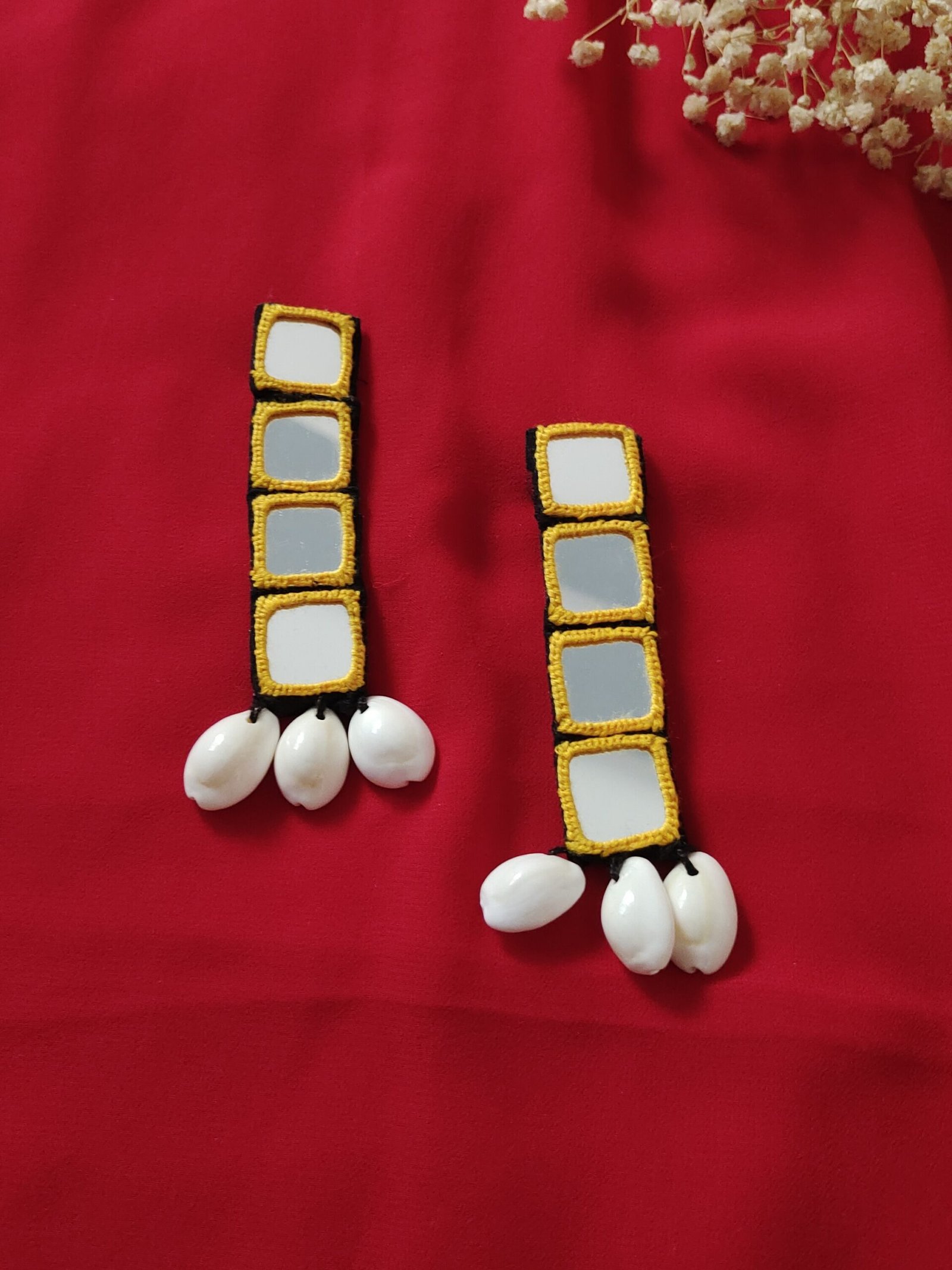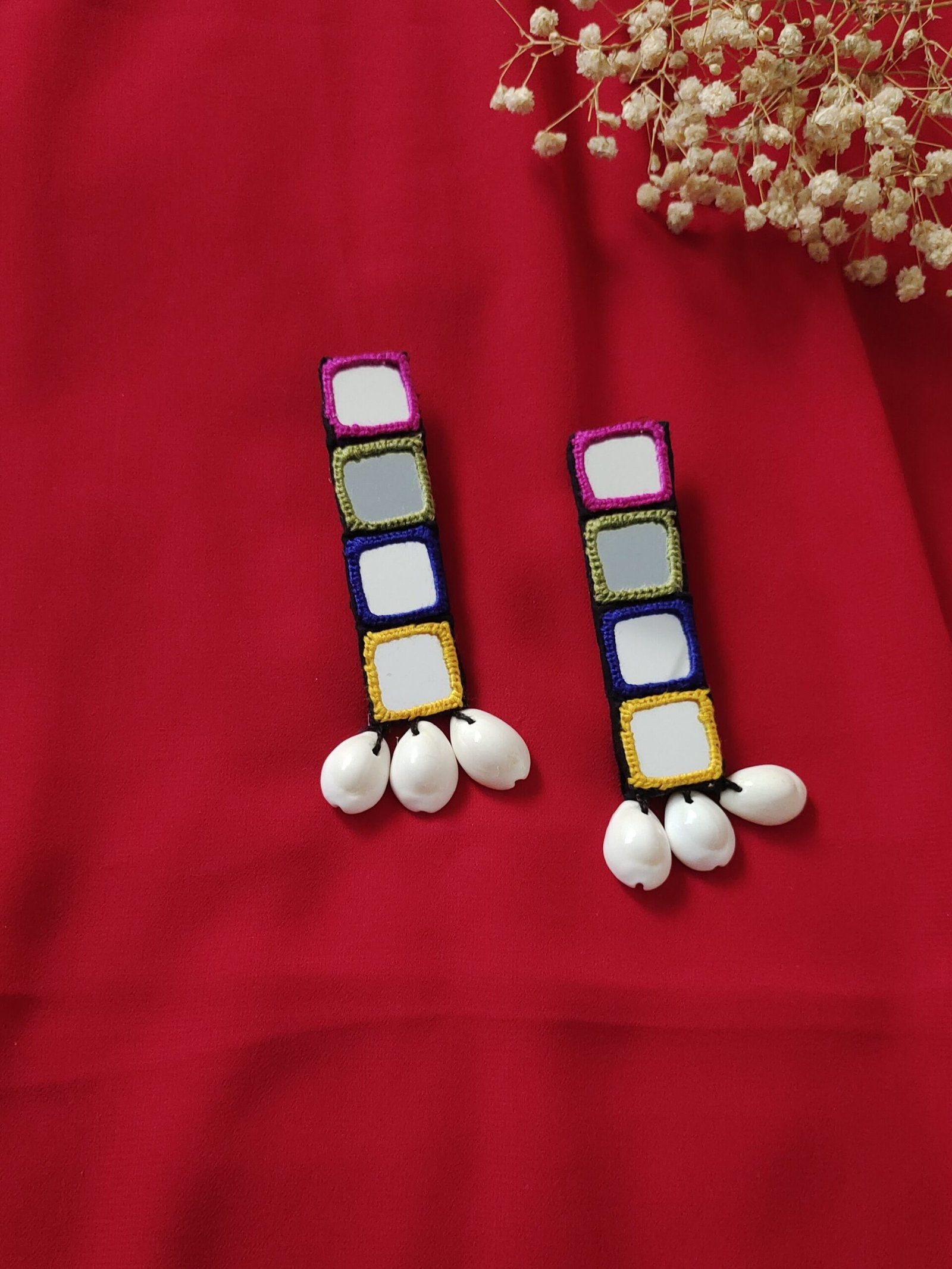 Tags: cowrie shell, earring, handcrafted, handmade, handmade earrings, mirror, mirror earring, Navratri collection, thread work