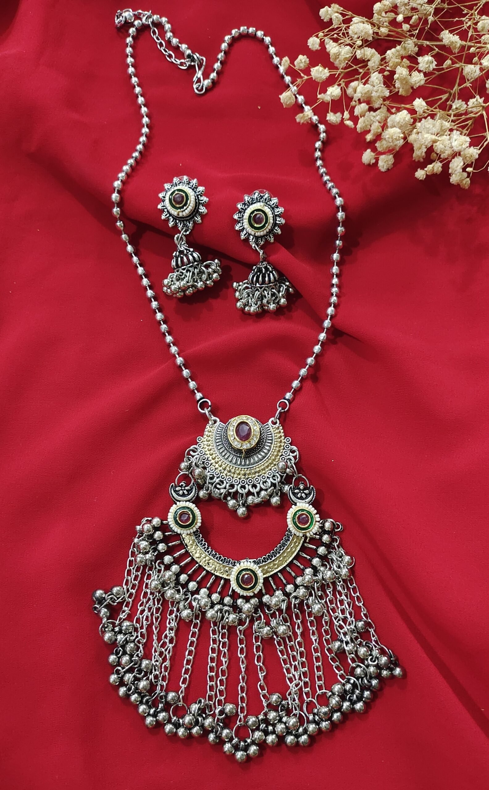 Adorn your neckline with our exquisite “Silver Bells Cascade Long Pendant Set.” This stunning piece features a detailed oxidized silver pendant, designed in two elegant tiers, with a touch of subtle red or maroon stone accent at its center. From the graceful crescent-shaped base, numerous fine chains dangle, each adorned with tiny silver beads that mimic the joyful chime of bells. The pendant is beautifully suspended from a long, beaded oxidized silver chain, offering a versatile length. Completing the look are matching jhumka earrings, echoing the detailed floral stud and bell design of the necklace. This set is perfect for adding a touch of traditional charm and elegant movement to any ethnic wear or making a distinctive statement.
