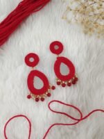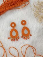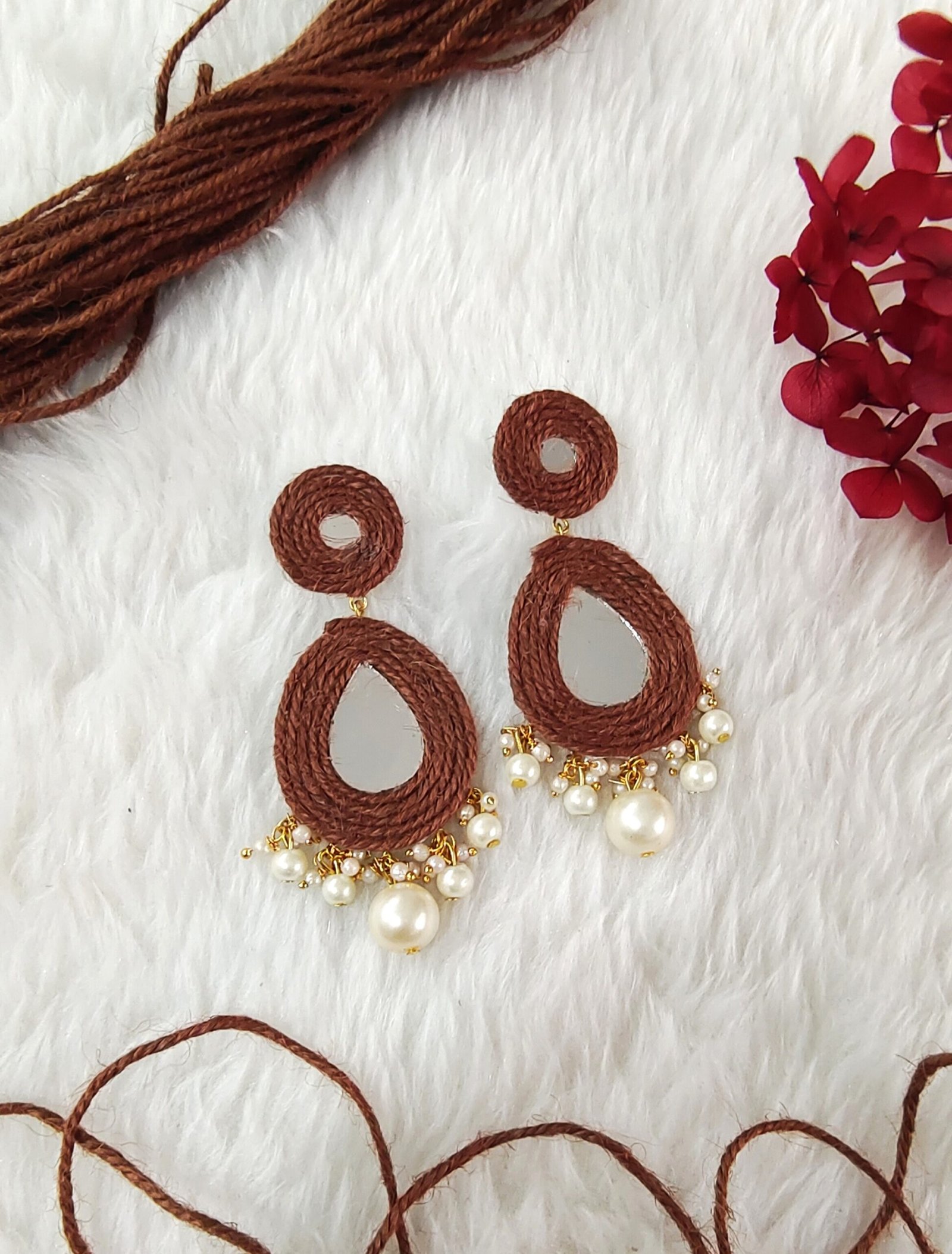 Artisanal earrings, where the thread (“Sutra”) weaves a story around a reflective mirror, adorned with beads.