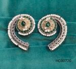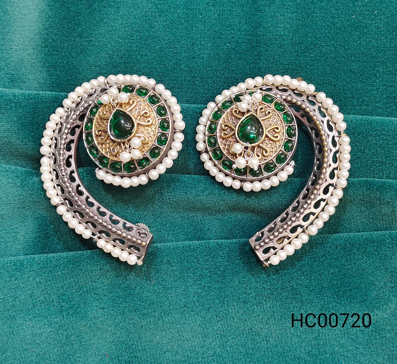The Anika Earcuffs, meaning “grace” or “favor,” perfectly highlight the detailed craftsmanship of the piece. The focus is a richly patterned medallion featuring a striking tear-drop shaped stone, intricately set within antique-tone metal. This centerpiece is dramatically framed by layers of small, glistening gems and shimmering simulated pearls. The unique cuff silhouette is defined by its deep curve and delicate filigree work, with the entire outer edge lined by a row of fine simulated pearls. These earrings offer an elevated, modern take on traditional jewelry.
