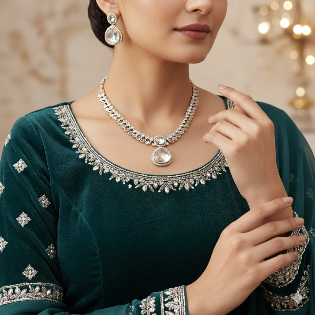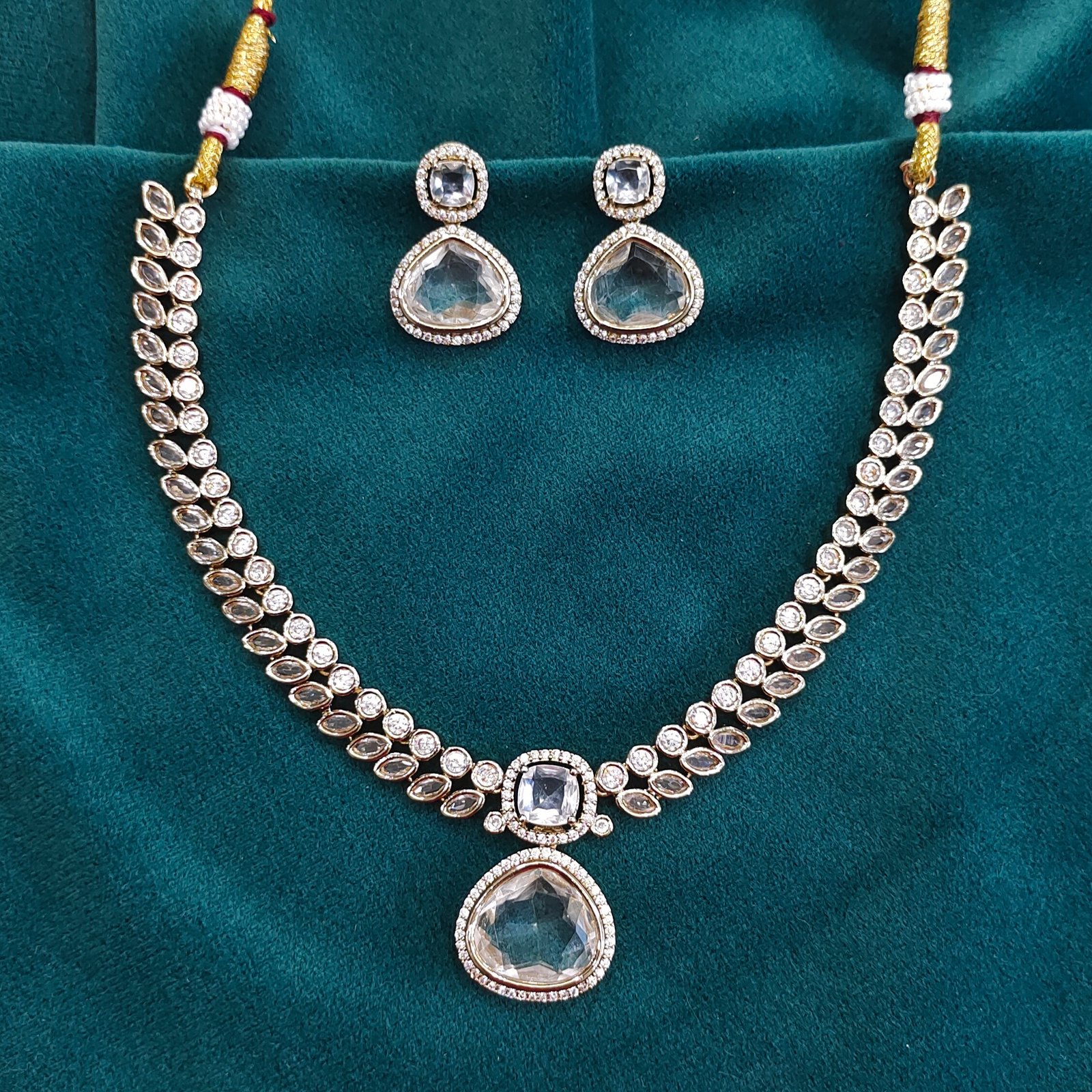 A stunning set embodying timeless elegance. The Divya Polki Set features a delicate, choker-style necklace and matching stud earrings. Crafted with brilliant Uncut Clear Stones (or Polki-style stones) encircled by sparkling cubic zircons, the design showcases a symmetrical leaf motif culminating in an eye-catching central teardrop pendant. This versatile piece is perfect for wedding celebrations, festive occasions, or adding a touch of classic grandeur to any outfit.