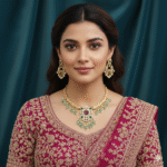 The Krishna Heritage Polki Choker is a masterpiece of traditional design. Crafted in an exquisite choker style, the necklace features a broad base intricately detailed with fine gold work and studded with sparkling Polki-style stones. The focal point is the stunning central motif highlighted by a deep ruby cabochon and framed by pearls. The entire look is softened by a beautiful fringe of light green jhumki-style beads, giving it a luxurious, traditional sway. Complete with complementary earrings, this set is a must-have for the discerning jewelry collector.