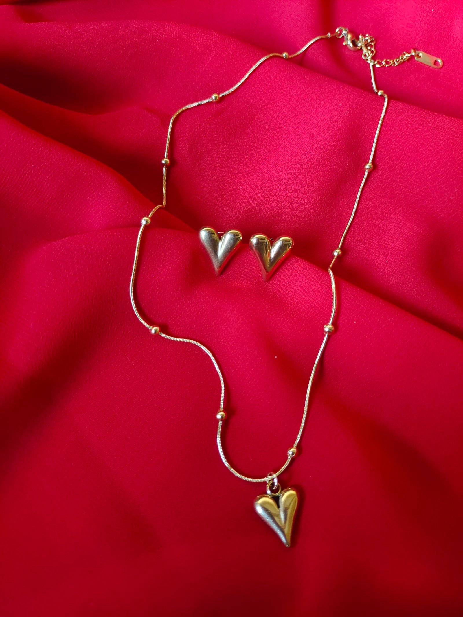 Add a touch of delicate charm with our Whispering Heart Necklace & Stud Set. This elegant collection showcases a fine silver-toned chain leading to a beautifully rendered, subtly abstract heart pendant. The set is completed by a pair of matching stud earrings, each featuring the same gentle heart design. Understated yet captivating, this versatile set is ideal for everyday wear, layering, or as a sweet accent for any occasion, offering a quiet statement of love and grace.